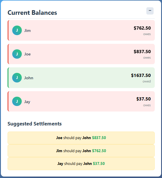 - (coming soon) a button will appear to the right of each suggested settlement, which signifies that the user's have completely the recommended settlement. When clicked, the users and the amount will be entered in an a payment in the "Payments" tab, and recalculate the respective current balances